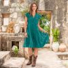 Sleeveless. two-pocket dress with shell button front. removable belt. deep side slits and ruffles at armholes and neckline. Partially lined. Linen/viscose. Machine wash. Imported. Exclusive. Sizes XS (0 to 2). S (4 to 6). M (8 to 10). L (12 to 14). XL (16 to 18). XXL (20 to 22). Approx. 51L.