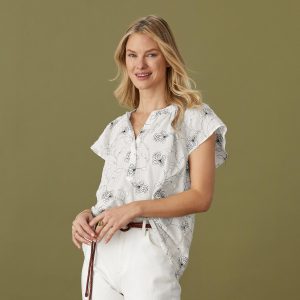 Sleeveless. two-pocket dress with shell button front. removable belt. deep side slits and ruffles at armholes and neckline. Partially lined. Linen/viscose. Machine wash. Imported. Exclusive. Sizes XS (0 to 2). S (4 to 6). M (8 to 10). L (12 to 14). XL (16 to 18). XXL (20 to 22). Approx. 51L.
