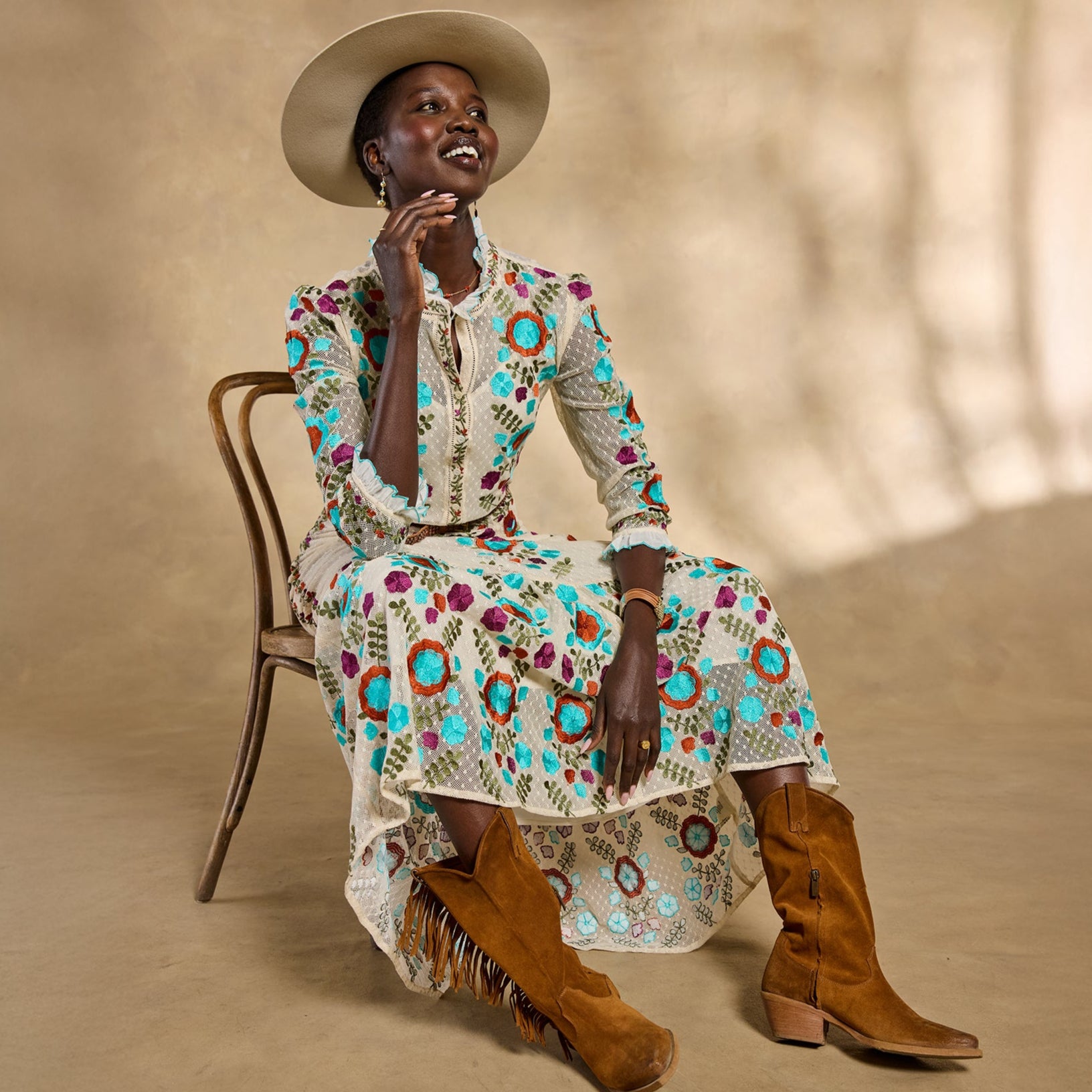 An absolute showstopper. our Ary Embroidered Maxi Dresss is a sleek. figure-flattering column of drama—featuring delicate mesh. brilliant allover floral embroidery and feminine lace at the neck and bracelet-length sleeves. Button front; fully lined. Hand wash. Imported. Sizes XS (0–2). S (4–6). M (8–10). L (12–14). Approx 56l.