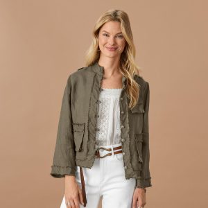 Here’s a match made in heaven: the sweet structure of an ultra-femme blazer. with the easygoing vibes of softest linen! Five-button placket with high-notch collar. flap pockets. back cinch belt and contrast floral lining. Cotton/linen. Machine wash. Imported. Exclusive. Sizes XS (0-2). S (4-6). M (8-10). L (12-14). XL (16-18). XXL (20-22). Approx. 25.5l.