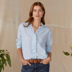 This classic. button-up blouse has timeless style and a fresh. feminine twist with ruffle details at neckline and cuffs. Beautifully draping. with back pleat and slight shirttail hem. Rayon. Machine wash. Imported. Sundance exclusive. Sizes XS (4). S (6). M (8?C10). L (12). XL (14). XXL (16). Approx. 25.5l.