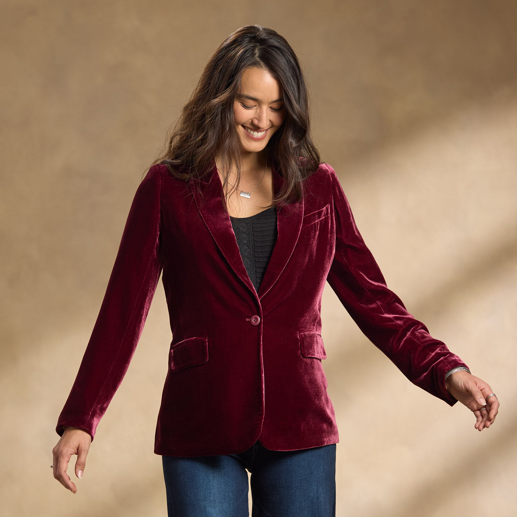 Our easy velvet blazer in a classic fit boasts a pretty vintage lining in blooming florals. back vent and four button cuffs. Two pockets with flap closure. Viscose/silk. Dry clean. Imported. Exclusive. Sizes 0-14. Approx. 26l.