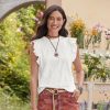 Beautiful floral and geometric embroidery flutters across the front and back of this easy-fit. notch neck top with cap sleeves and side slits. Cotton. Machine wash. Imported. Sizes XS (4). S (6). M (8-10). L (12). XL (14). XXL (16). Approx. 26l.