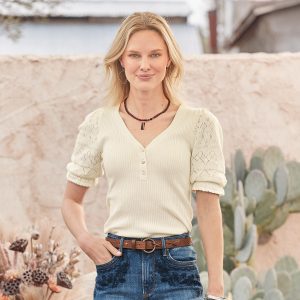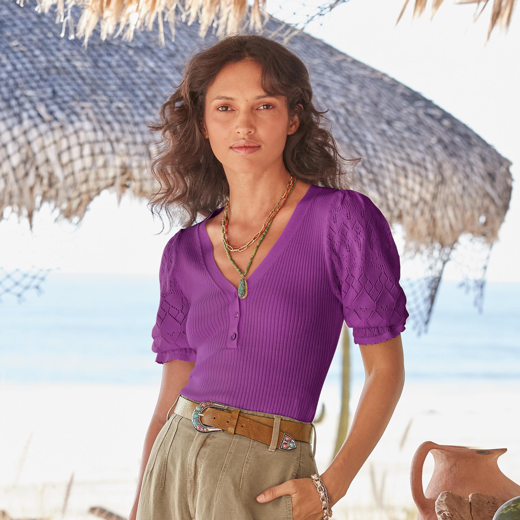 Experience the essence of luxury in our feminine and fitted V-neck henley. so soft in our Legends Lightweight Yarn. Beautiful pointelle at the bold puff sleeves and special scalloped trim details add an extra touch of grace. Organic cotton/nylon/spandex. Machine wash. Imported. Exclusive. Sizes XXS (00). XS (0?C2). S (4?C6). M (8?C10). L (12?C14). XL (16?C18). Approx. 20.5l.